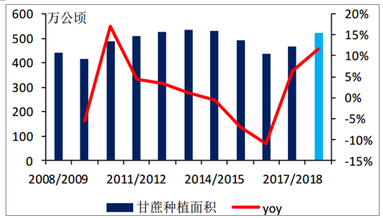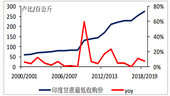 1998年為保護國內(nèi)甘蔗種植戶收益、抑制糖價大幅波動,印度政府開始實施甘蔗收購價政策。2018/2019榨季印度政府將甘蔗收購價由255盧比/100公斤提高至275盧比/100公斤,高于印度甘蔗種植成本70%以上。受此影響,預(yù)計2018/2019榨季印度甘蔗種植面積顯著增加,甘蔗產(chǎn)量或?qū)⒃俣仍黾印?/p>
