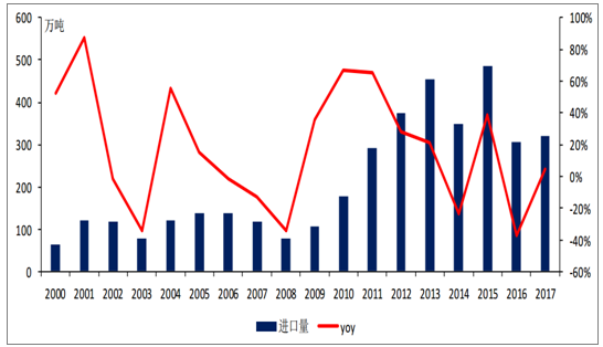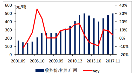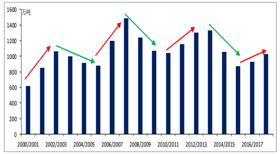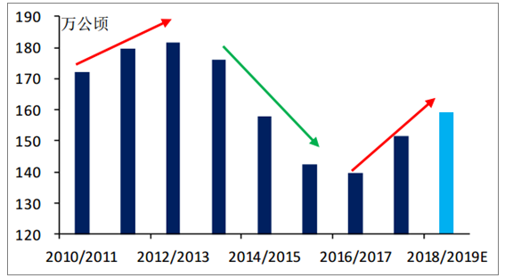我國甘蔗主產(chǎn)區(qū)廣西實施甘蔗最低收購價政策,每年開榨前制定當年甘蔗收購價。2017/2018榨季廣西甘蔗收購價由475元/噸提高至500元/噸,種植面積進一步增加。此外,從歷史上來看,我國糖產(chǎn)量仍處于三年增產(chǎn)周期,預(yù)計國內(nèi)糖2018/2019榨季供應(yīng)增加。